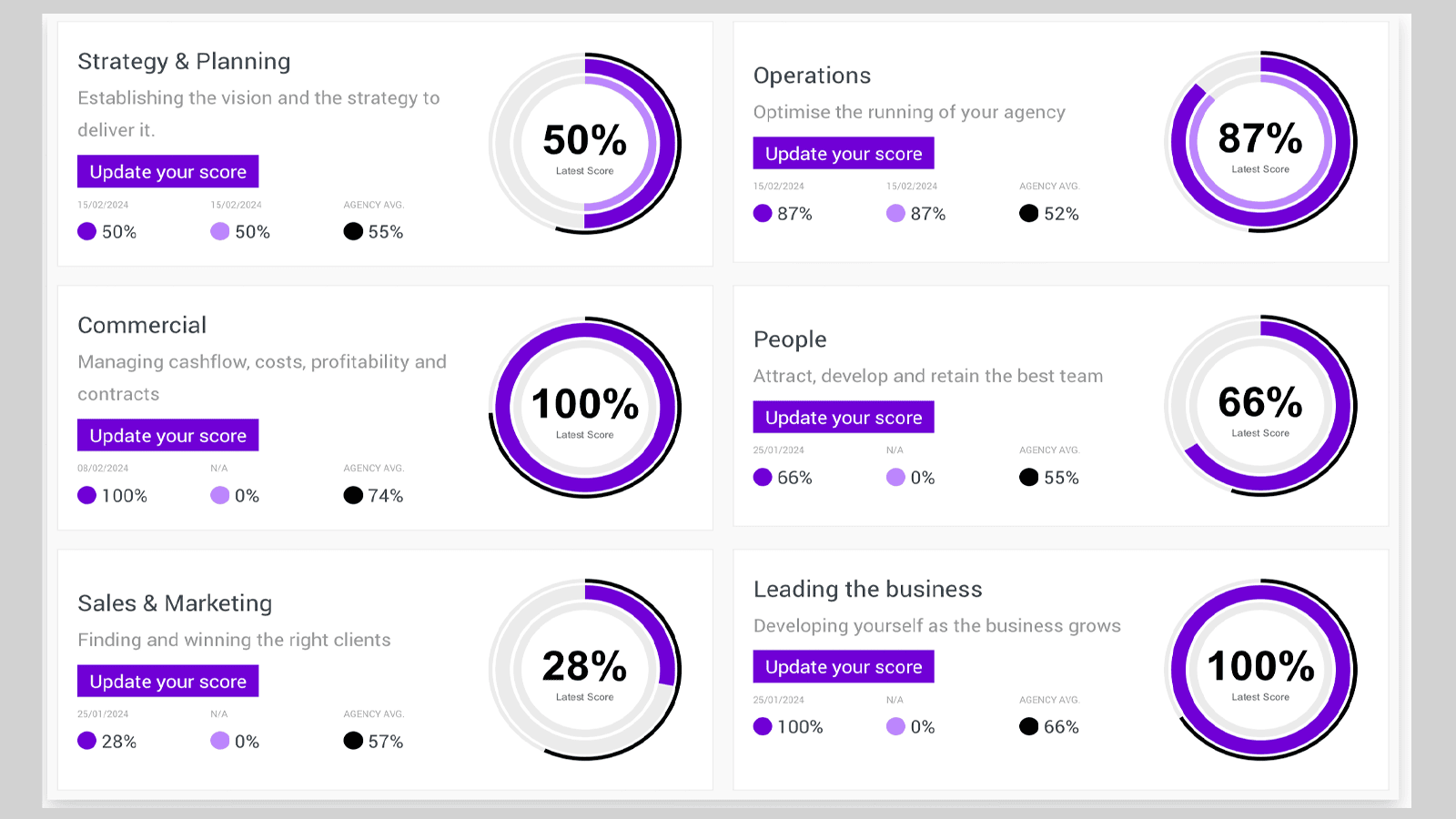 The scorecard is there for you to not just benchmark, but use as a tool to highlight areas to focus on. It is designed to review every aspect of a successful agency, so you may find a few areas to focus on to help with your next step of your business.
